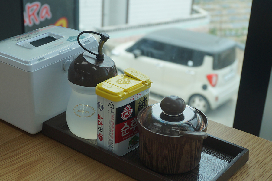 저희는 물막국수랑 회막국수 이렇게 두가지로 주문했어요. 가게 테이블에 식초와 후추, 양념장이 놓여져 있고, 메뉴는 벨이 울리면 직접 픽업해서 가지고 오면 돼요.