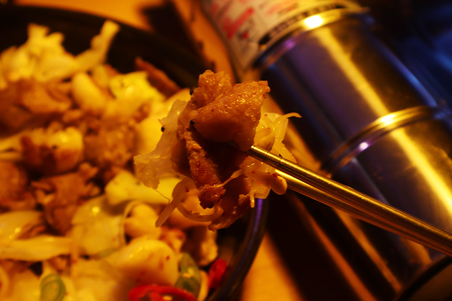 다음으로 나온 안주, 돼지고기 볶음 요리였는데요. 얇게 썰려진 돼지고기랑 통마늘, 양배추를 달달 볶아서 옆에 콩나물 무침이랑 백김치랑 같이 담겨져 나온 메뉴였어요.