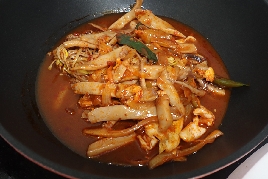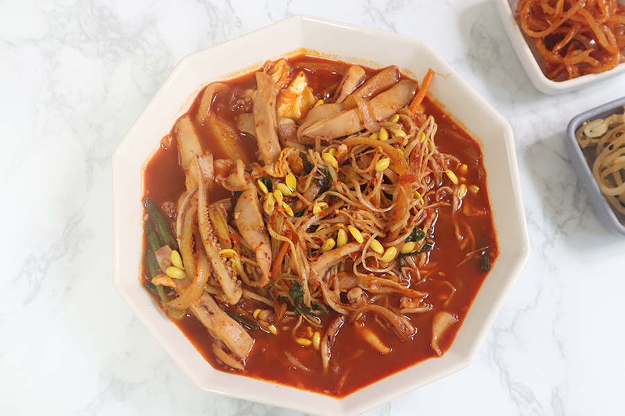팩에 담겨져 있는 콩나물오징어볶음은 적당량 먹을만큼 담아서 끓여주시면 되는데요. 미리 그 전에 한 번 조리한 상태로 담겨오기 때문에 적당하게 끓는다 싶으면 완성이 된 거에요.