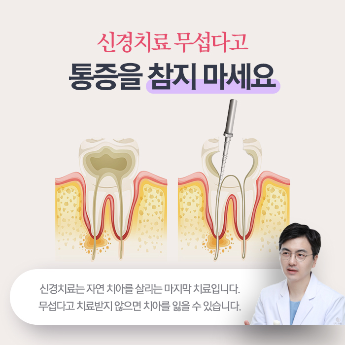 아픔은 물론이고 자연치의 내구도에 큰 영향을 미치는 신경에까지 염증이 번질 수 있는데